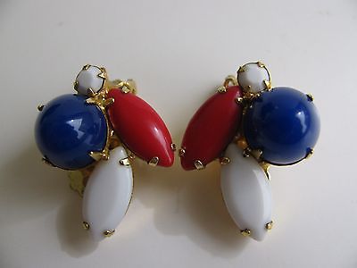 VINTAGE MILKGLASS EARRINGS RED WHITE BLUE CLIP ON