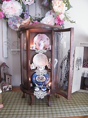 VINTAGE SALESMAN SAMPLE MINI CURIO CABINET with 3 TEA SETS and DOILIES !!!