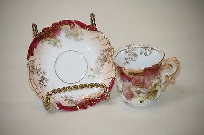 Title (ebay affiliate link): Antique Demitasse Tea Cup & Saucer Wine Burgundy Peach w Gold Scrolls Flowers