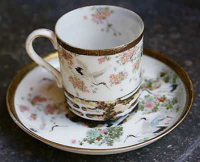 Meiji Period Japanese Porcelain Cup Saucer Cranes Artist Signed Slip Decorated