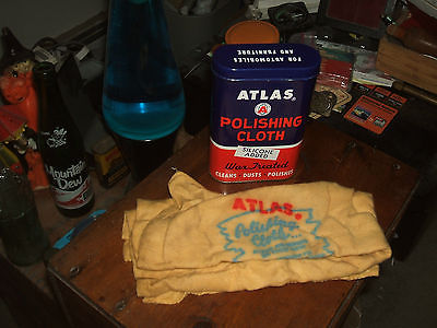 OLD VINTAGE ATLAS SUPPLY CO USA AUTOMOTIVE POLISHING CLOTH w/TIN LITHO CAN