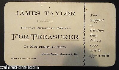 Title (ebay affiliate link): James Taylor for Democratic Treasurer, Monterey County 1902 Campaign Card