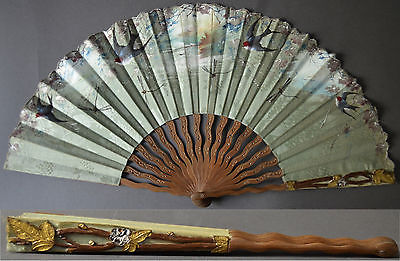 DECORATIVE 19TH C FRENCH ART NOUVEAU FAN HAND PAINTED BIRDS TEXTURED TEXTILE