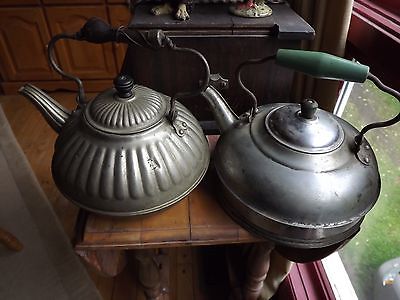 Two Antique Vintage Metal Decorative Tea Pots, Kettles, Teapots, Green Handle