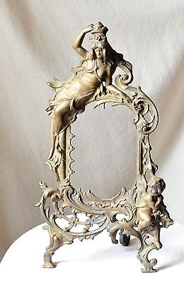 Antique Gold Gilt Cast Iron Easel Picture Frame: Semi-Nude Queen/Maiden & Cherub