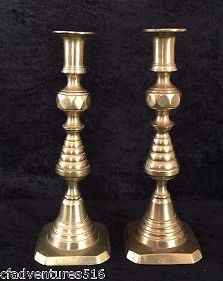 PAIR OF ANTIQUE ENGLISH DIAMOND PATTERN BRASS CANDLE STICKS
