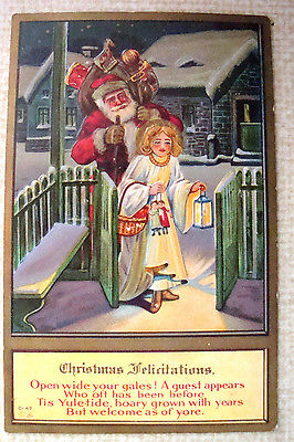 Vintage Embossed postcard Santa with sack full of toys & Angel carrying Lantern