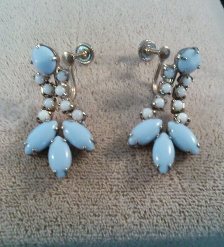 Vintage Blue Milk Glass Earrings Screw Back Silver Tone