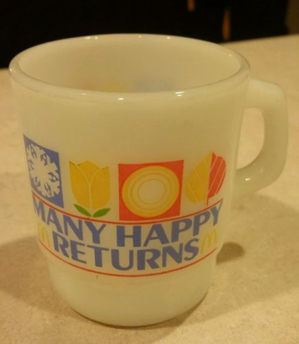 Title (ebay affiliate link): Rare McDonalds MANY HAPPY RETURNS Stacking Milk Glass Cup/Mug With D Handle 1982