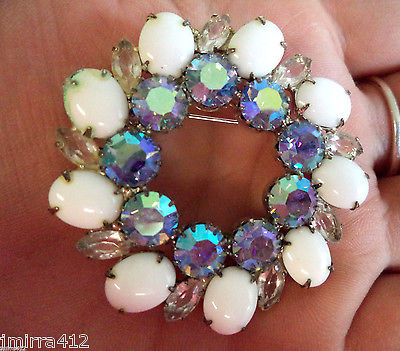 Title (ebay affiliate link): STUNNING VINTAGE ESTATE HIGH END MILK GLASS AB RHINESTONE WREATH BROOCH!!! 642A