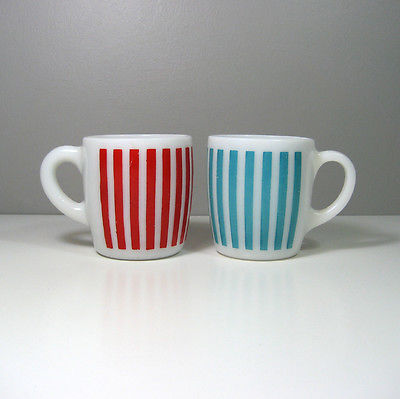 Title (ebay affiliate link): Hazel Atlas Candy Stripe Mugs Red Turquoise Blue Milk Glass Coffee Cups