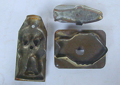 3 vintage tin figural cookie cutters, 2 fish and a person, no reserve *