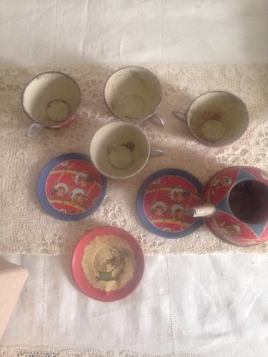 Title (ebay affiliate link): Ohio Art 8 piece "Three little Kittens" Aluminum Child's Tea Set Vintage