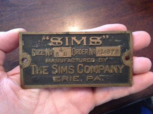 Vintage The Sims Company Erie, PA Brass Plaque Sign Size & Order No. Advertising