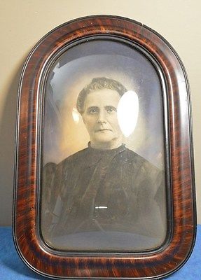 ANTIQUE CURVED CONVEX BUBBLE GLASS TIGER WOOD PICTURE FRAME WITH PICTURE
