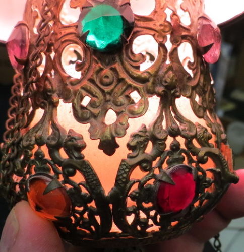 early Brass & colored glass Jeweled Fairy hanging Lamp candle holder votive RARE