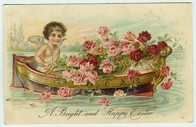 Title (ebay affiliate link): Easter Greetings Cherub Angel Steering Boat Full of Roses UDB Embossed Postcard