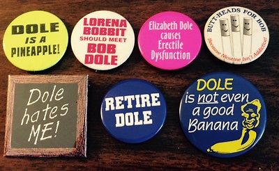 Title (ebay affiliate link): Humorous Lot of Seven Anti-Bob Dole Political Pin Pinback Buttons