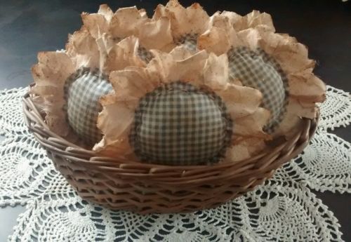 Title (ebay affiliate link): Set of six primitive handmade sunflower ornies/bowl fillers country blue check