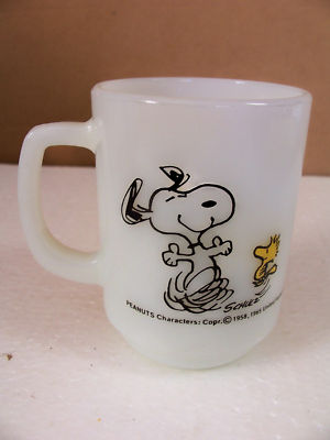 1958 Fire King Peanuts Snoopy Dancing Milk Glass Mug