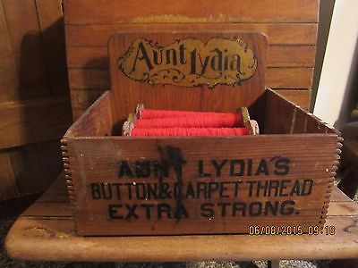 Title (ebay affiliate link): ANTIQUE~PRIMITIVE~AUNT LYDIA BUTTON & CARPET THREAD WOOD BOX~10 VINTAGE BOBBINS