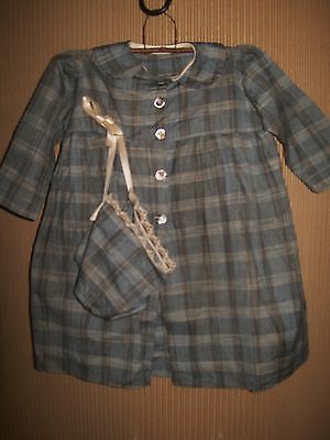 Primitive prairie little dress and bonnet cap blue/gray plaid woven fabric