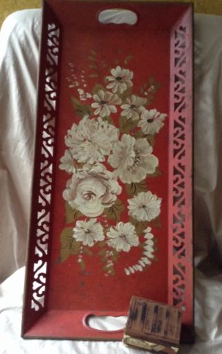 Title (ebay affiliate link): Vintage Hand Painted Tole Tray Red Metal With Cutwork And Cream And Gold Flowers
