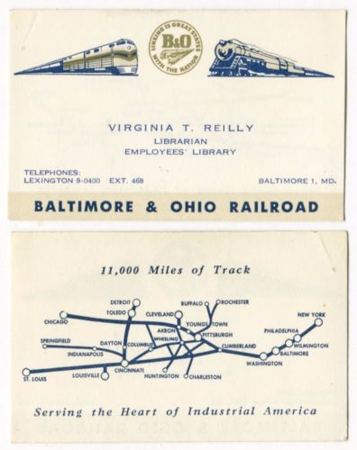 Title (ebay affiliate link): 1950s Baltimore & Ohio Railroad Train Business Card - Virginia Reilly Librarian