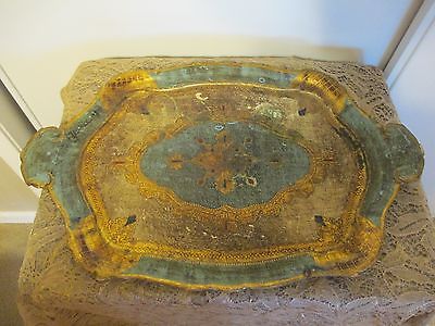 LRG Vintage Italian Florentine Gilt Wood Tole Tray Aqua/Gold/Brown 20.5" Long