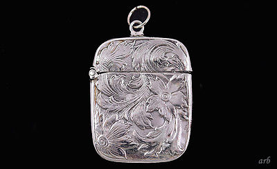 Nice Antique Sterling Silver Stamp Box/Case Keychain w/ Hand Chased Flowers