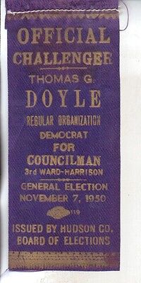 Title (ebay affiliate link): 1950 HARRISON NJ HUDSON COUNTY DEMOCRATIC ELECTION CHALLENGER RIBBON