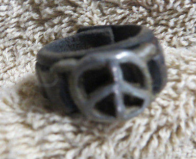 Title (ebay affiliate link): 1960's METAL PEACE SIGN RING WITH RIVETED LEATHER STRAP-HIPPIE WOODSTOCK ANTIWAR
