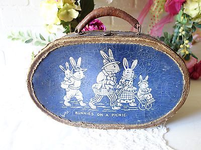 ANTIQUE VICTORIAN CHILDS BUNNY RABBIT SUITCASE DOLL BLUE LEATHER HANDLE