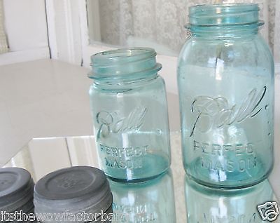VINTAGE BALL MASON AQUA BLUE GLASS CANNING JARS ZINC LIDS 1 PINT & 1 QUART SIZE