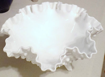 FENTON Glass White Milk Glass Hobnail 3 Toed Footed Candy Bowl Ruffle Dish