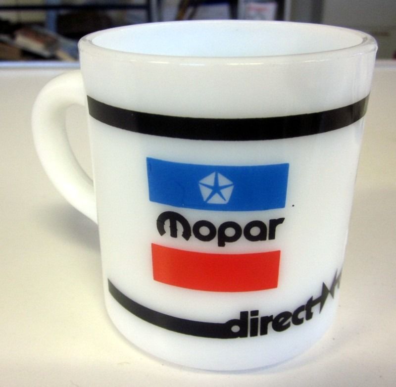 1970's MOPAR DIRECT CONNECTION MUSCLE CAR MILK GLASS COFFEE CUP MUG GRAPHICS!