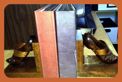 Title (ebay affiliate link): Antique Solid Wood Bookends. With Old World Carved Wood & Metal Dutch Shoes