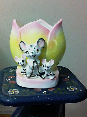 Title (ebay affiliate link): SMALL VINTAGE TULIP PLANTER VASE W/ MICE MOUSE FIGURINES ON IT MOM & KIDS MICE