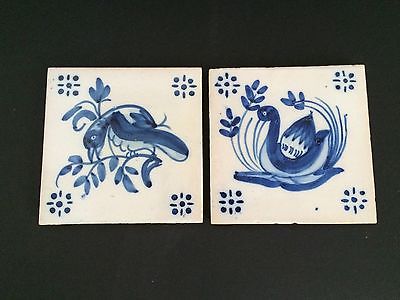 ANTIQUE PAIR BLUE DELFT TILES BIRD AND SWAN 5 1/2" SQUARE