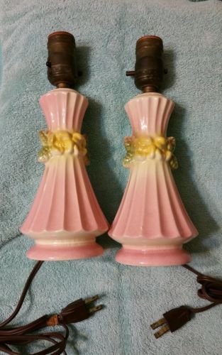 2 Vintage Ceramic 1940-1950's Pink yellow green matching lamps EUC