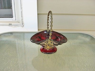 Vintage RUBY GLASS CANDY NUT DISH - Brass Accents