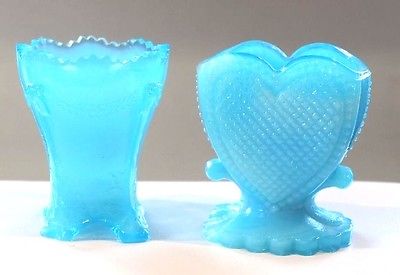 Title (ebay affiliate link): 2 Vintage Degenhart Blue Milk Glass Heart & Scroll Leaf Toothpick Holders