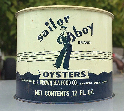 Title (ebay affiliate link): 12 FL. OZ. SAILOR BOY BRAND OYSTERS CAN OYSTER TIN R F BROWN LANSING MICH MI.