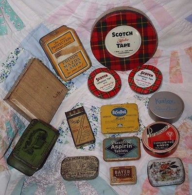 Title (ebay affiliate link): 14 VINTAGE SMALL TINS ADVERTISING LOT MAZDA BOYE HAIRPINS ASPIRIN GOGGLES TIRE