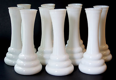 Title (ebay affiliate link): 10 Vtg RANDALL White Milk Glass 6" Bud Vases, Ring/Donut Style, Wedding Decor