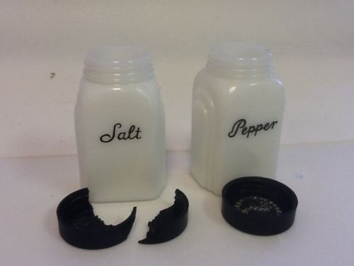 Title (ebay affiliate link): Vintage Milk Glass Salt/Pepper w/black Writing/Caps*Hazel Atlas? Anchor Hocking?