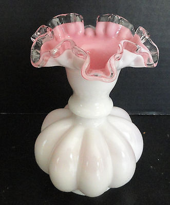 Title (ebay affiliate link): Fenton Silver Crest Cased Pink/Melon Milk Glass Double Ruffle Vase Vintage MINT