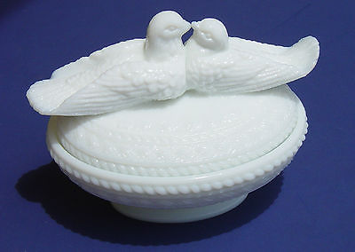 Title (ebay affiliate link): Westmoreland Milk Glass Love Birds Doves Paneled Rope & Basketweave Covered Dish