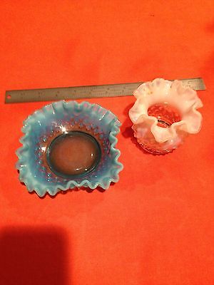 Vintage-Fenton-Milk-Glass-Hobnail-Aqua-Double-Ruffled and little white vase
