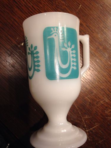 Title (ebay affiliate link): Vintage MCM milk glass teal blue Rooster Print Footed Pedastal Mug
